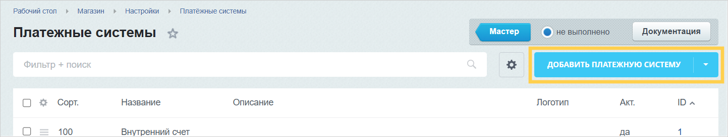 В административной панели 1С-Битрикс перейдите в раздел Магазин → Настройки → Платежные системы и нажмите кнопку Добавить платежную систему.