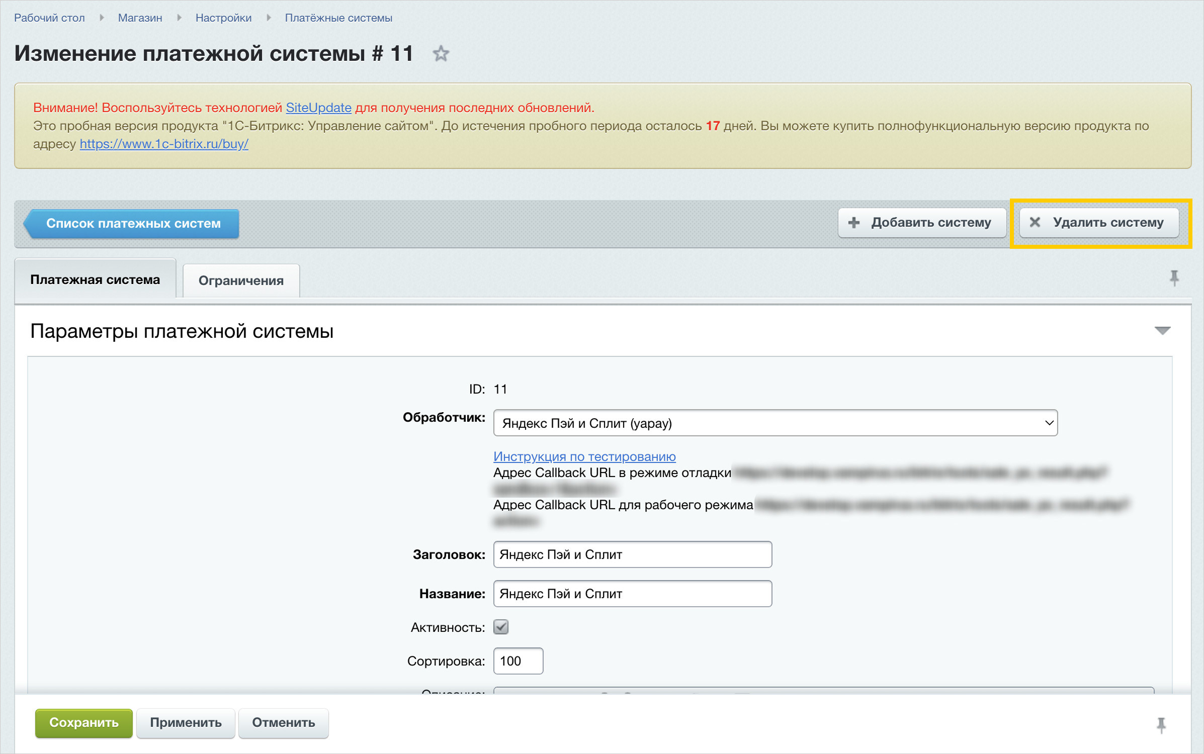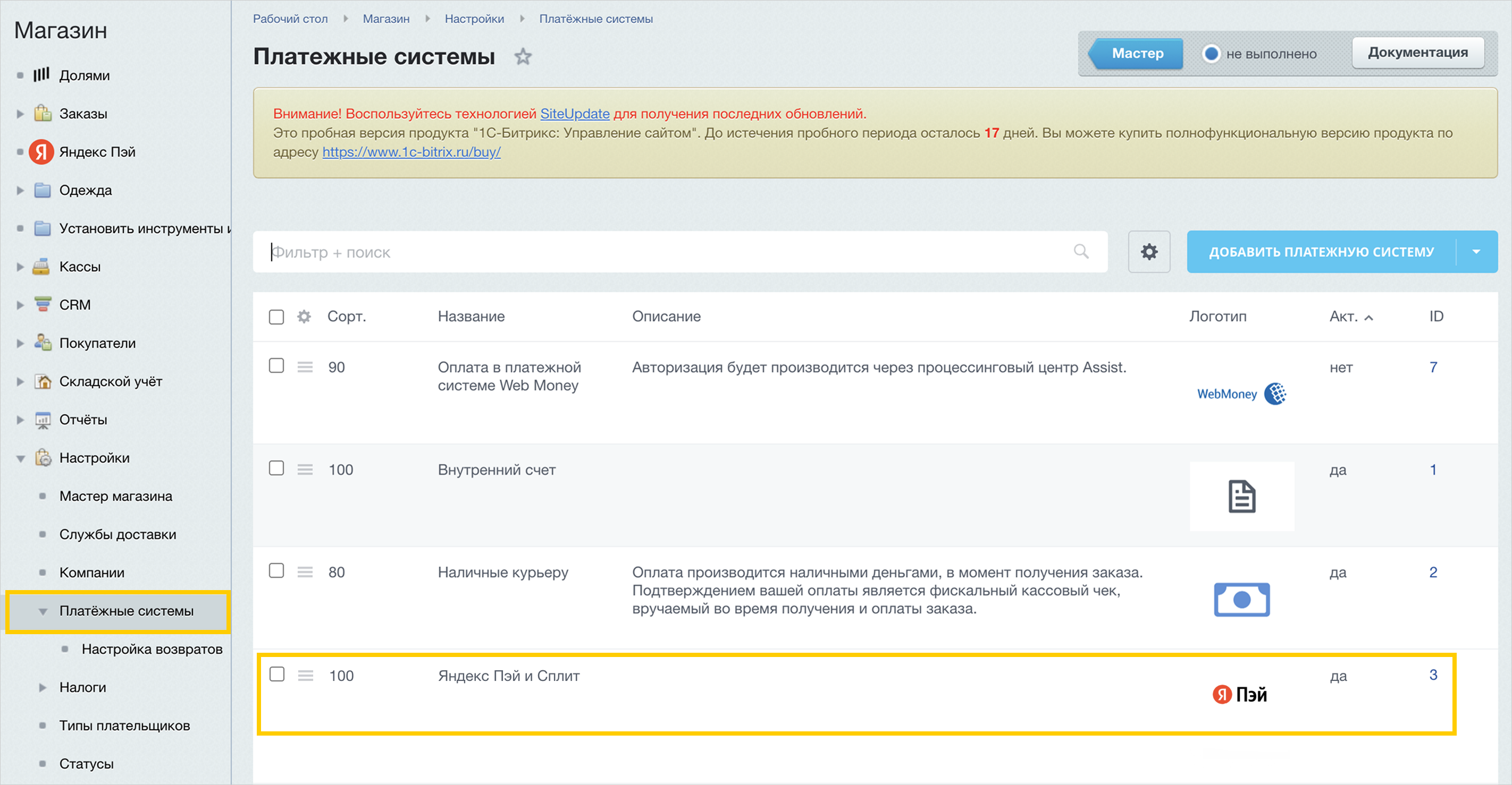 В административной панели 1С-Битрикс перейдите в раздел Магазин → Настройки → Платежные системы и в списке подключенных платежных систем выберите систему Яндекс Пэй и Сплит, которую вы подключили с помощью модуля более ранней версии.