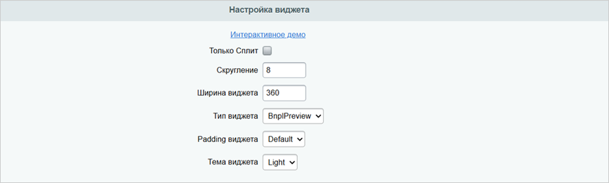 Выберите платежную систему Яндекс Пэй и Сплит и в блоке Настройки виджета задайте параметры отображения виджета.