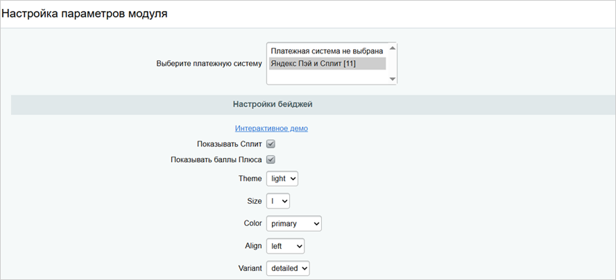 Выберите платежную систему Яндекс Пэй и Сплит и в блоке Настройки бейджей задайте параметры отображения бейджей.