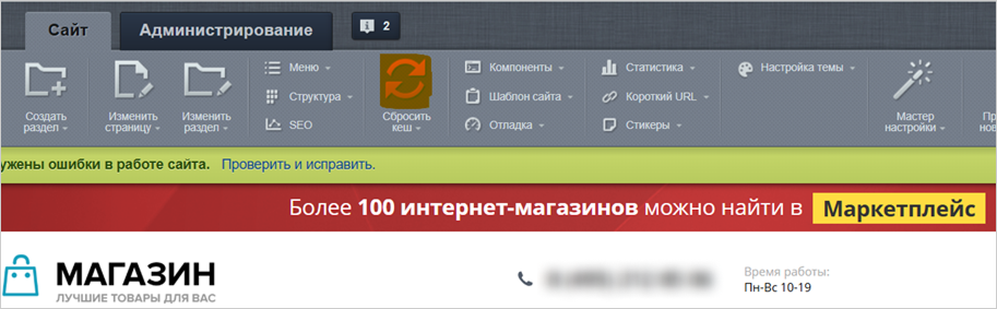 При тестировании отображения бейджей и виджетов можно обновлять кеш сайта с помощью кнопки Сбросить кеш: