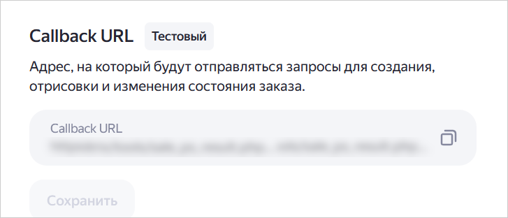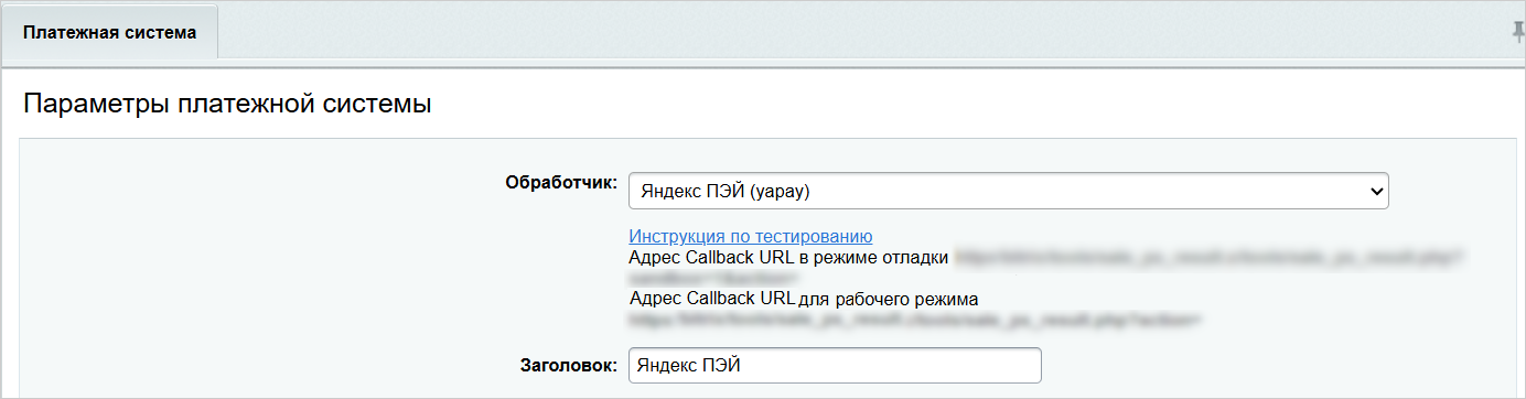 В параметрах платежной системы в поле Обработчик выберите Яндекс Пэй (yapay). Отобразятся адреса Callback URL для режима отладки сервиса и рабочего режима.