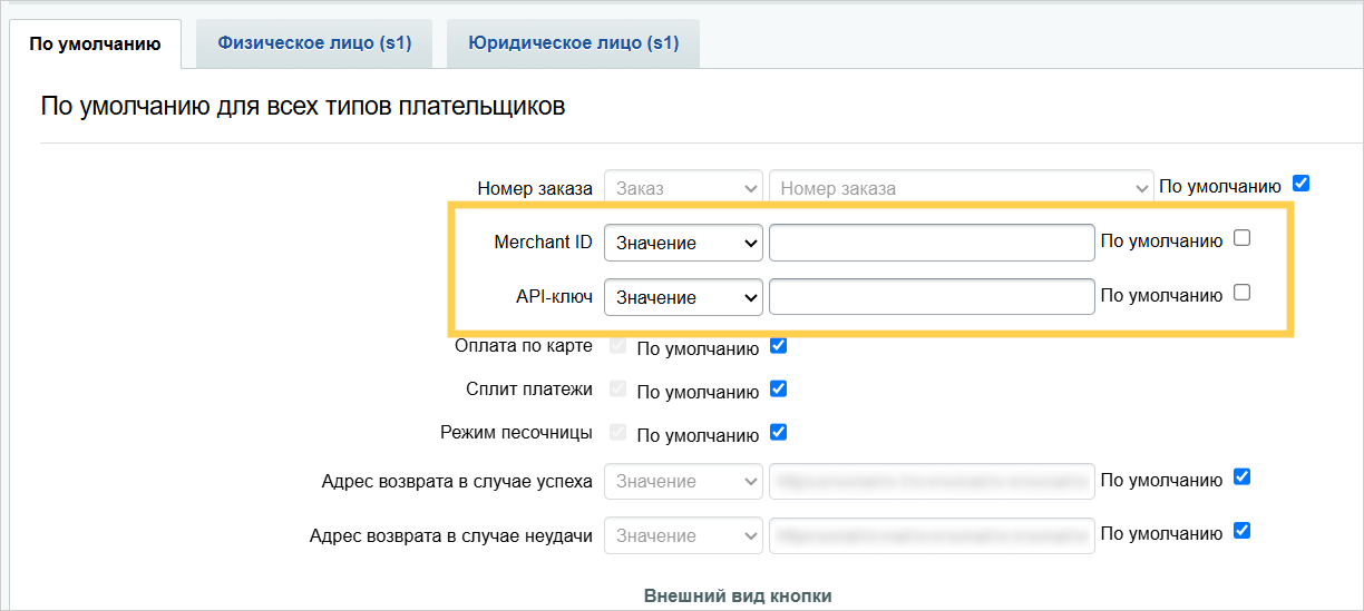В параметрах платежной системы укажите Merchant ID и API-ключ из личного кабинета Яндекс Пэй.