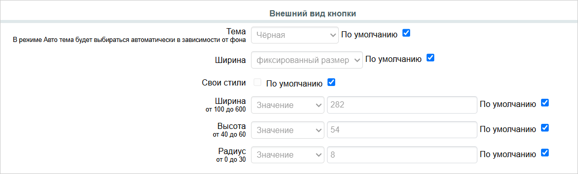 Чтобы отредактировать ширину, высоту и радиус кнопки, включите опцию Свои стили и укажите необходимые размеры.