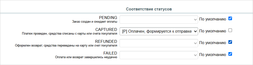 В разделе Соответствие статусов при необходимости можно настроить смену статуса заказа по событиям: