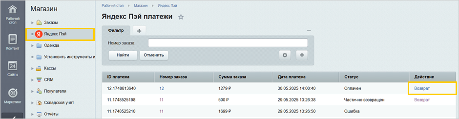 В административной части сайта перейдите в раздел Яндекс Пэй и у платежа, который необходимо вернуть, нажмите Возврат.
