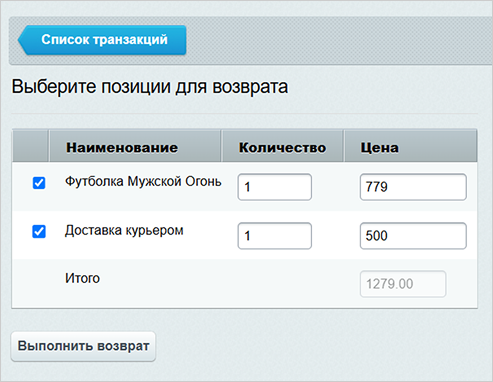 Выберите позиции для возврата, укажите количество или сумму и нажмите кнопку Выполнить возврат.