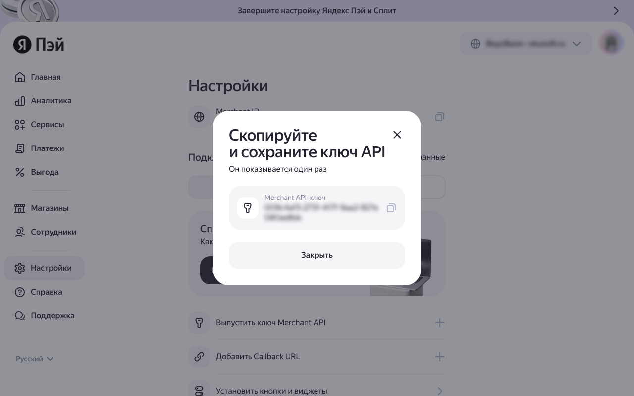 Укажите API-ключ из личного кабинета Яндекс Пэй.