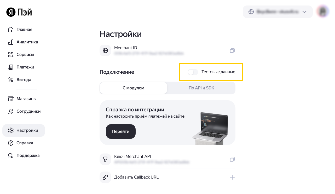 В личном кабинете Яндекс Пэй перейдите в раздел Настройки, выберите в селекторе нужный магазин и в правом верхнем углу включите опцию Тестовые данные.