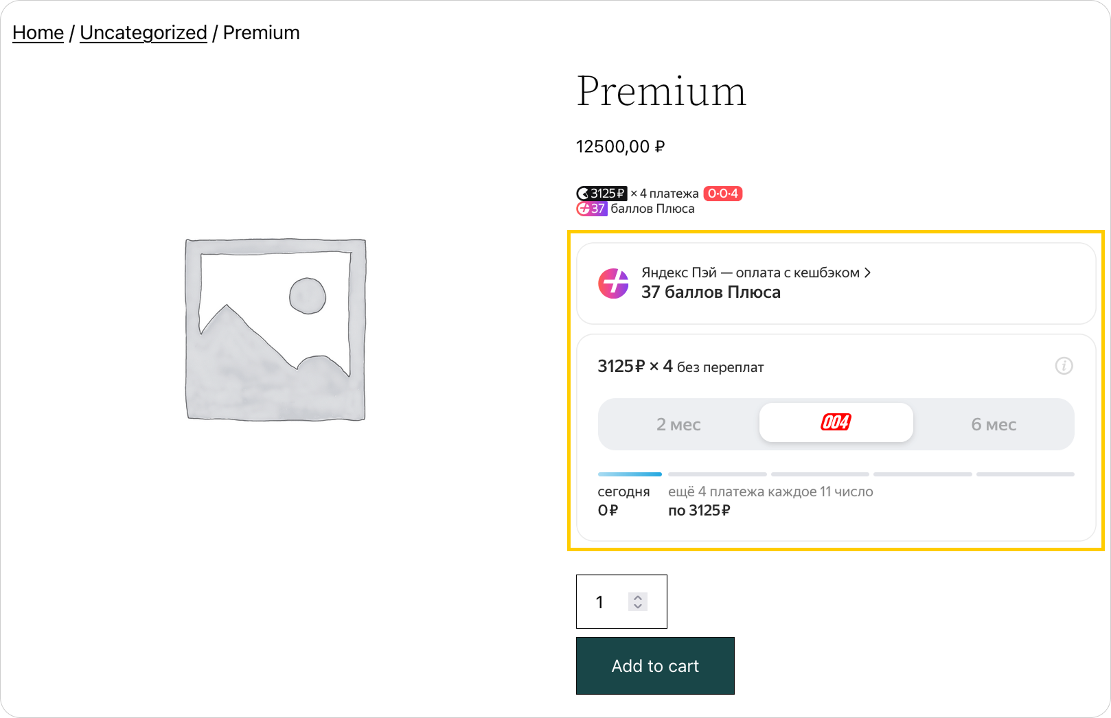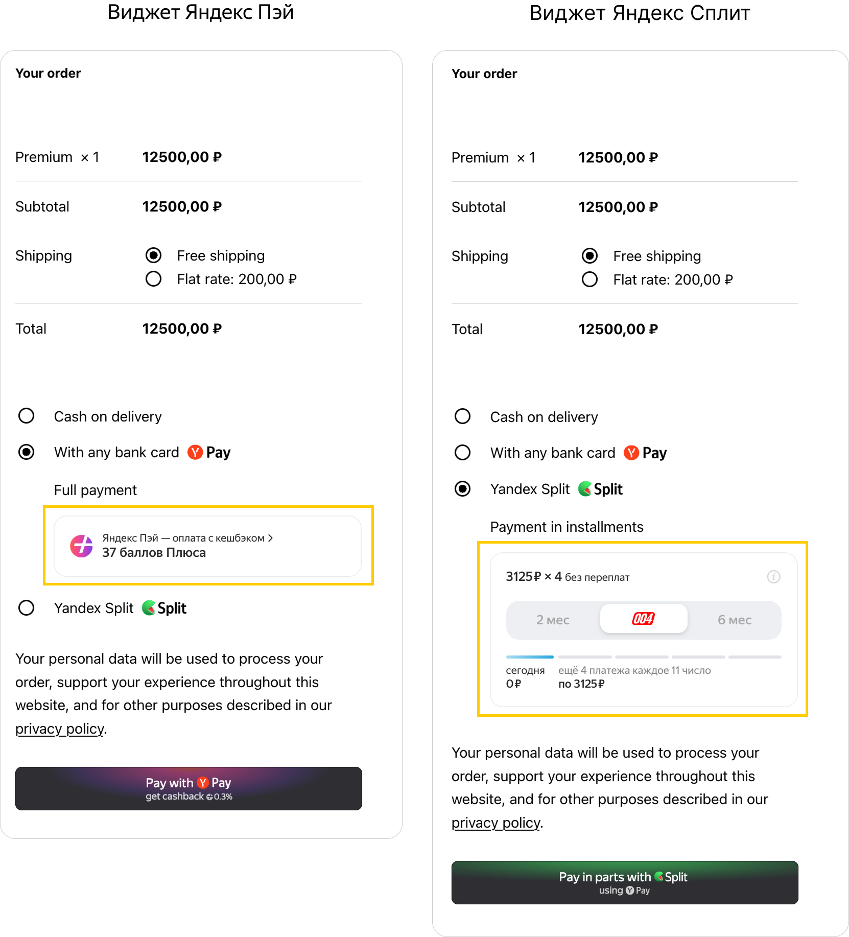 Виджеты Яндекс Пэй могут отображаться в карточке товара и на странице выбора способа оплаты: