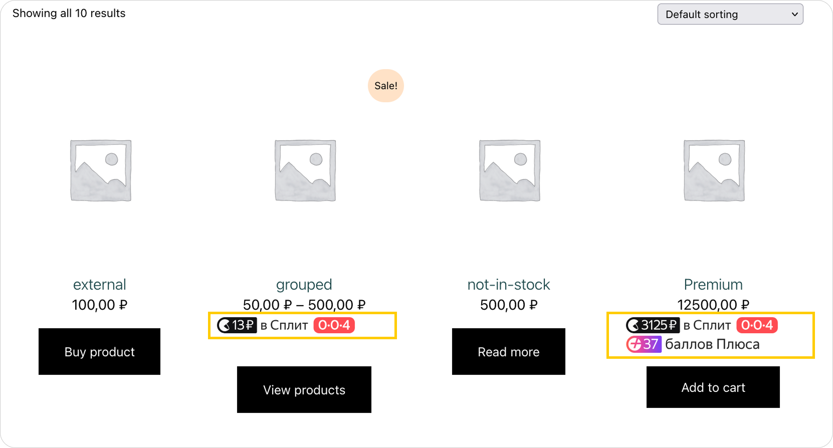 Бейджи Яндекс Пэй могут отображаться на странице с товарами и в карточке товара: