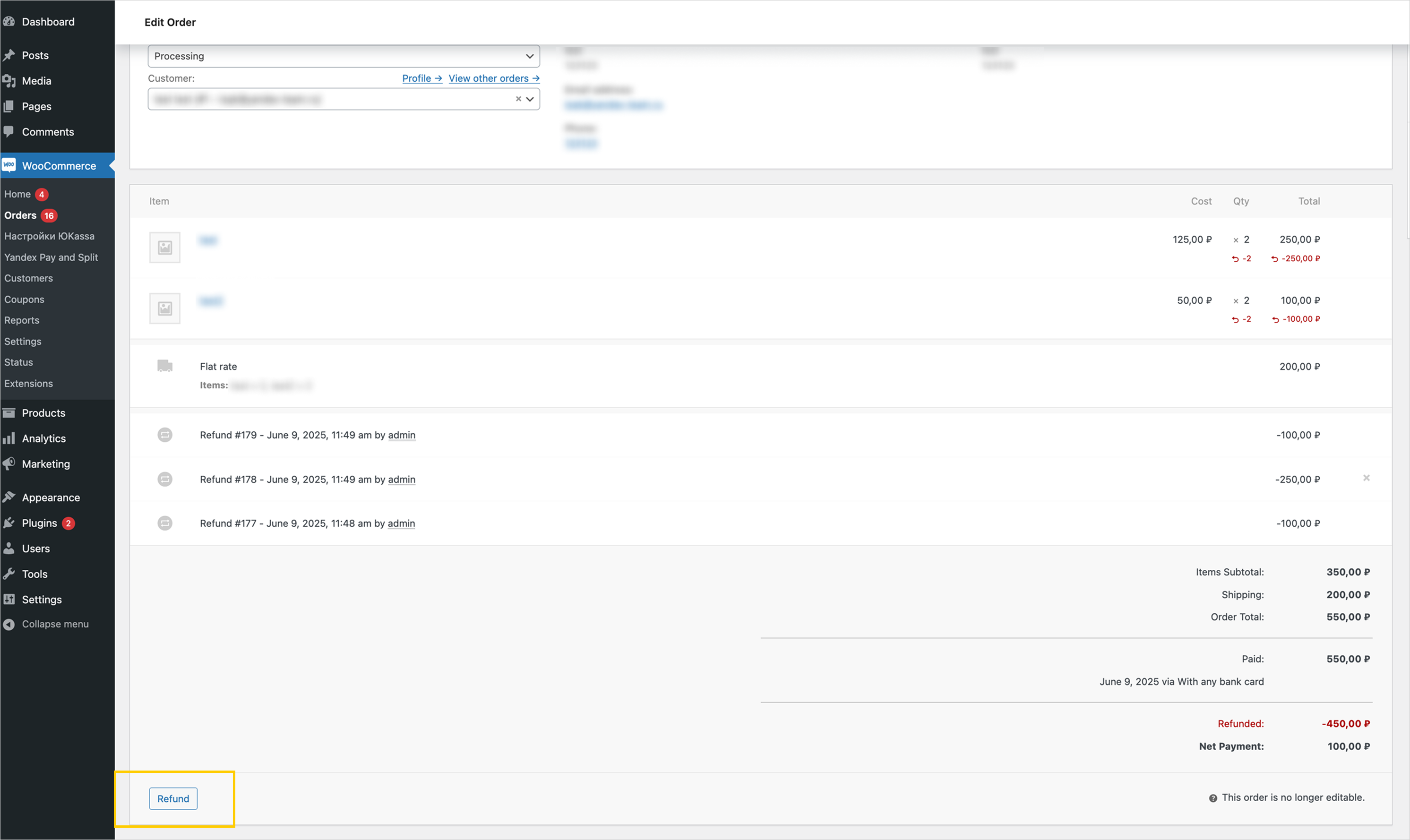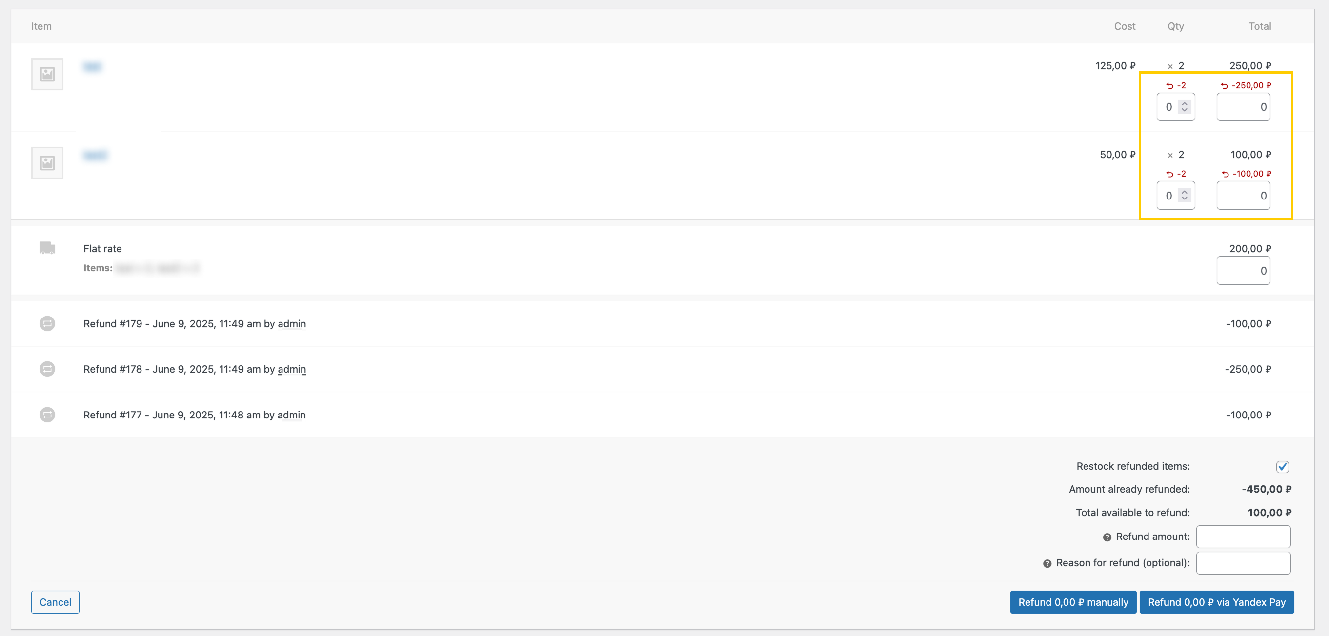 В административной панели WordPress вы можете оформить полный или частичный возврат средств по заказу: