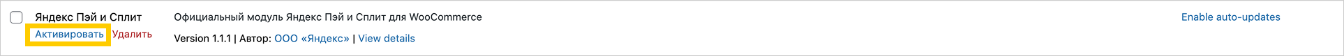 В списке плагинов найдите Яндекс Пэй и Сплит и нажмите Активировать.