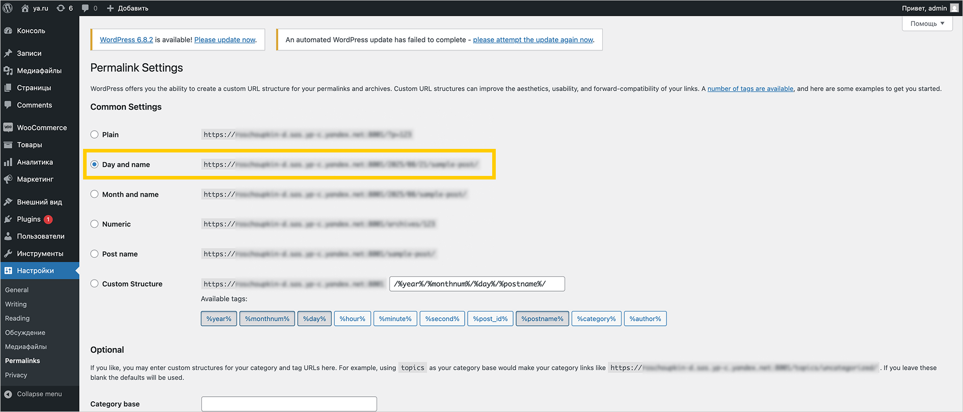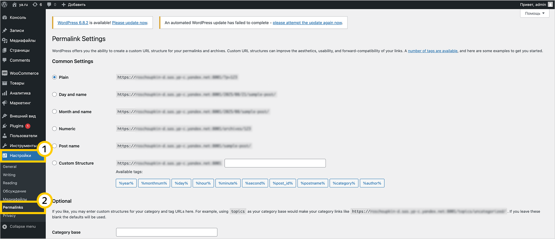 В левом меню административной панели перейдите в раздел Настройки → Permalinks.
