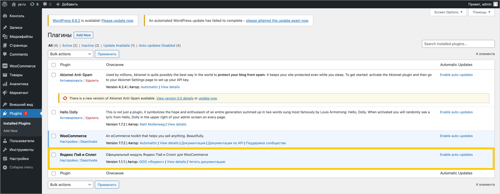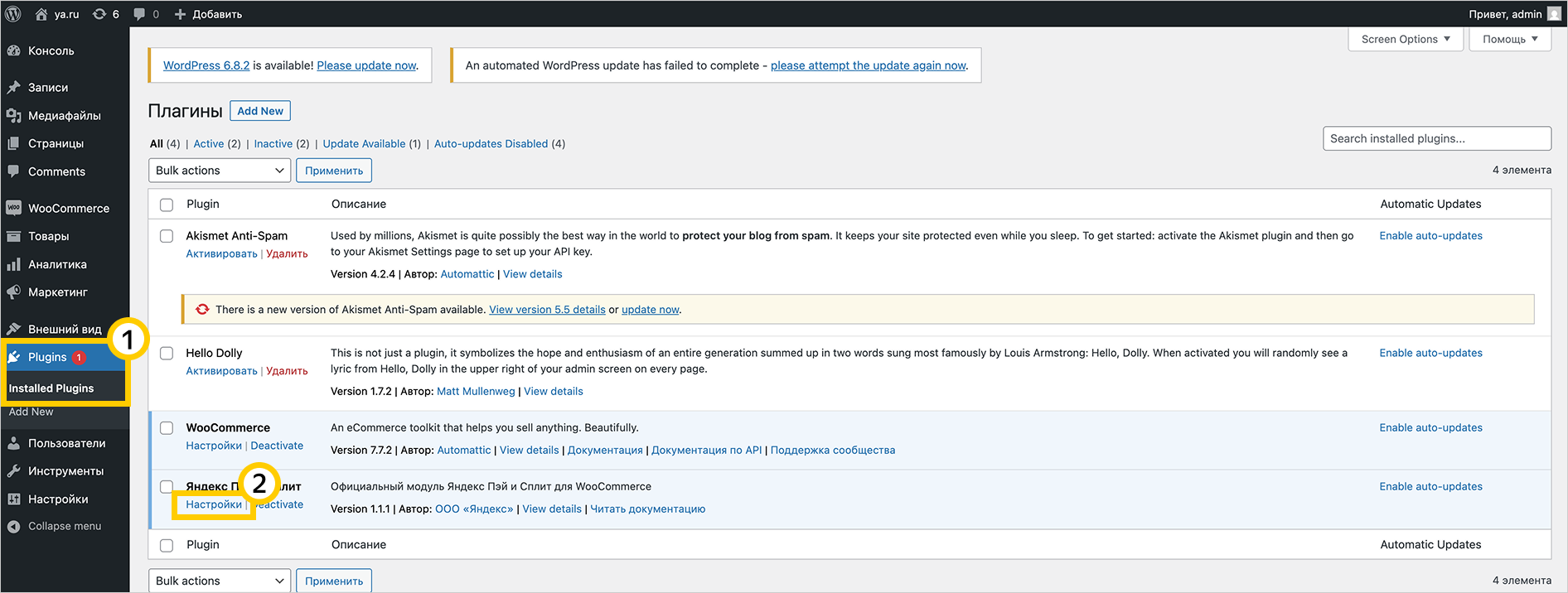 В административной панели слева перейдите в раздел Woocommerce → Яндекс Пэй и Сплит.