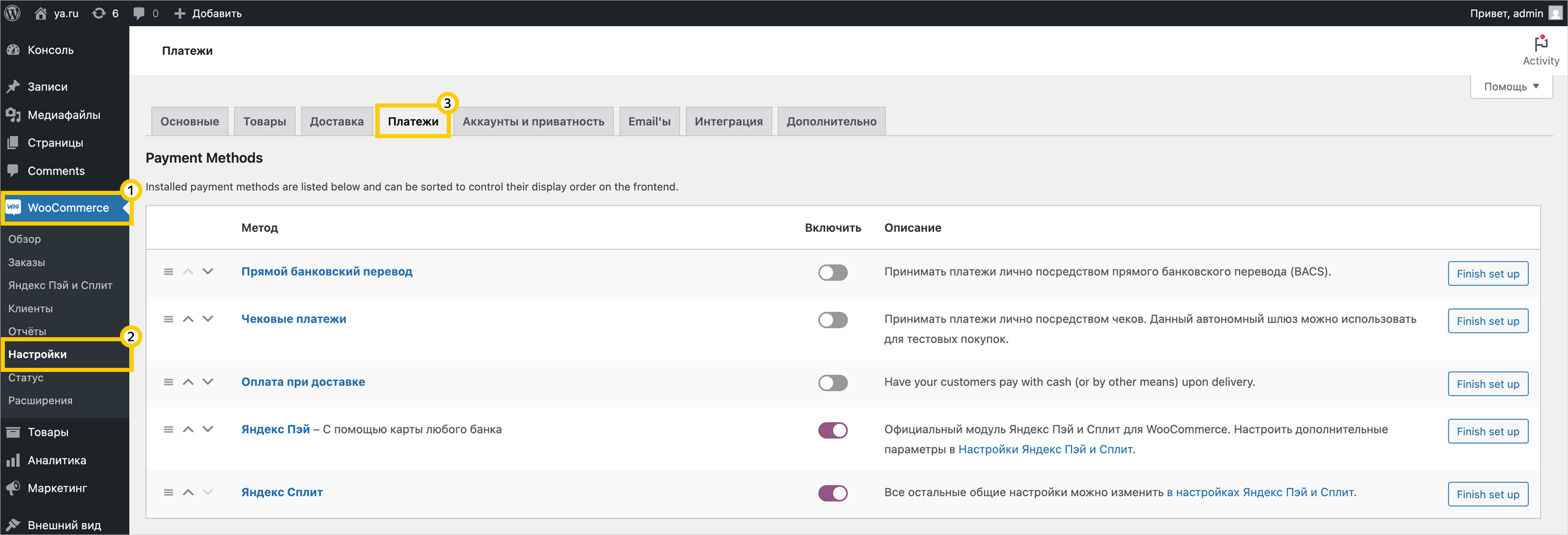 В левом меню административной панели перейдите в раздел Woocommerce → Настройки → Платежи.