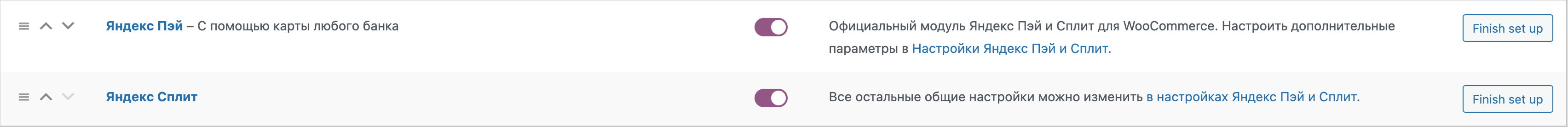 Модуль предоставляет два метода оплаты — Яндекс Пэй и Яндекс Сплит. Чтобы включить или выключить метод оплаты: