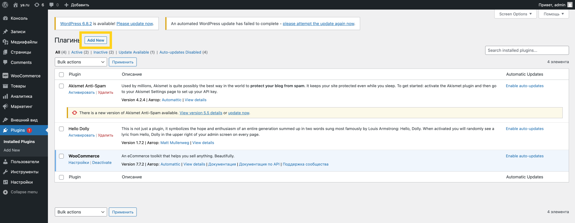 В левом меню административной панели WordPress перейдите в раздел Plugins и нажмите кнопку Add New.