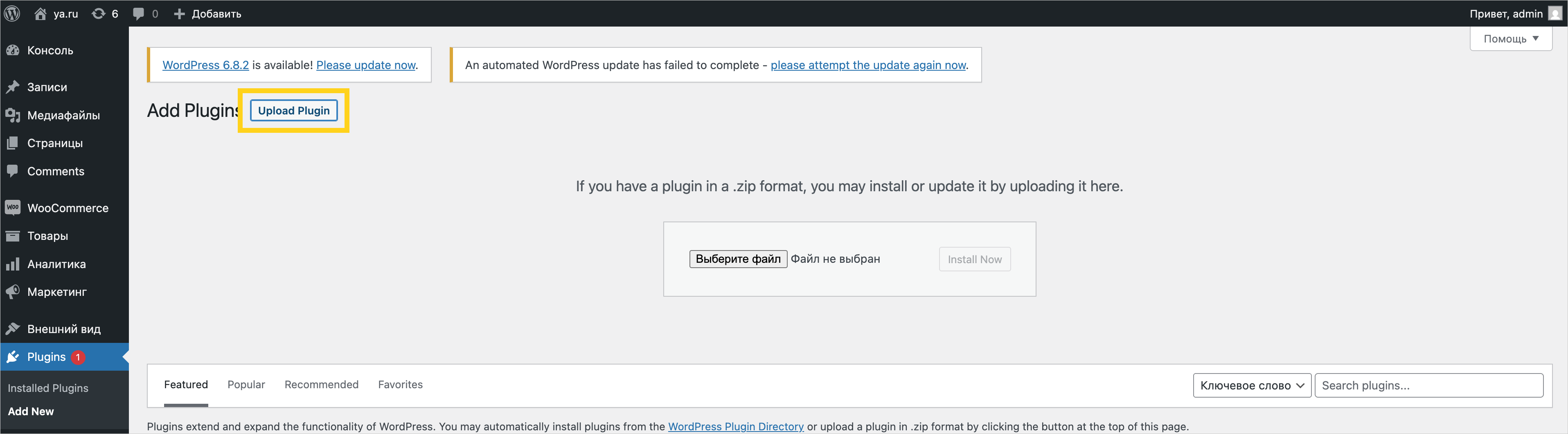 В открывшемся окне нажмите кнопку Upload Plugin → Выбрать файл и выберите скачанный установочный архив.