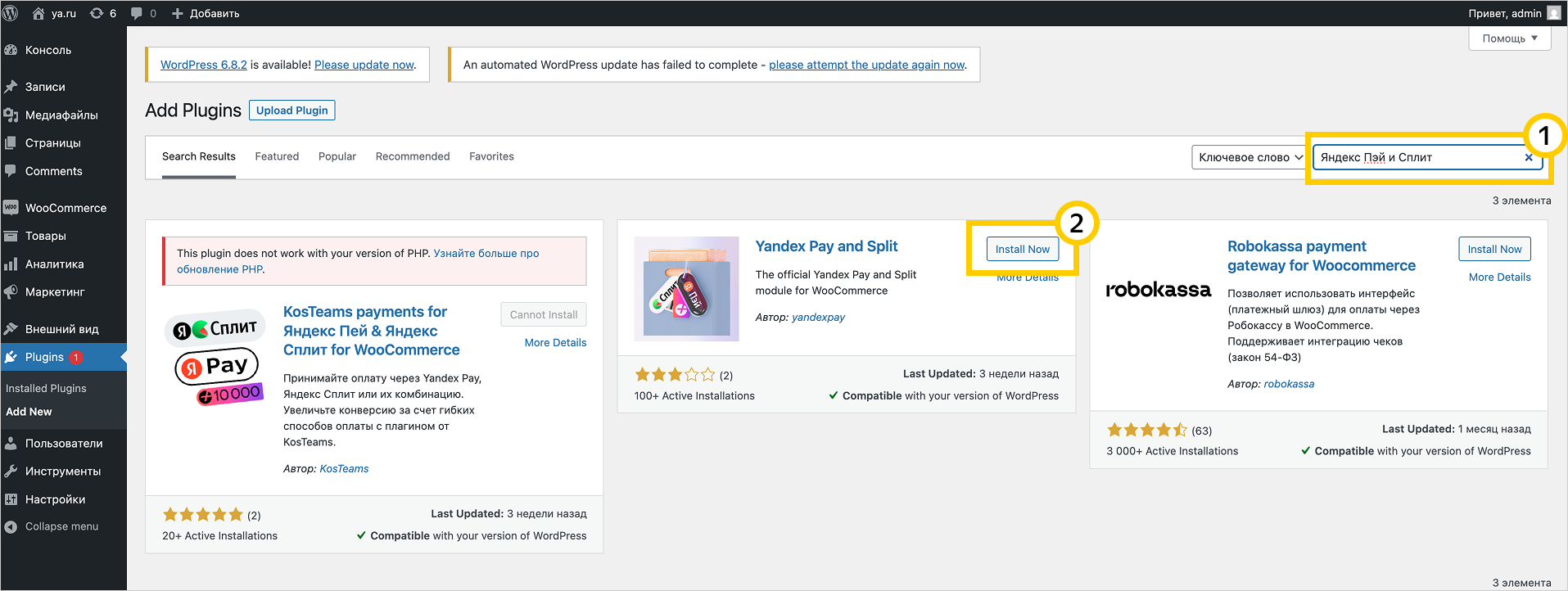 С помощью поисковой строки найдите плагин Яндекс Пэй и Сплит и нажмите кнопку Install Now.