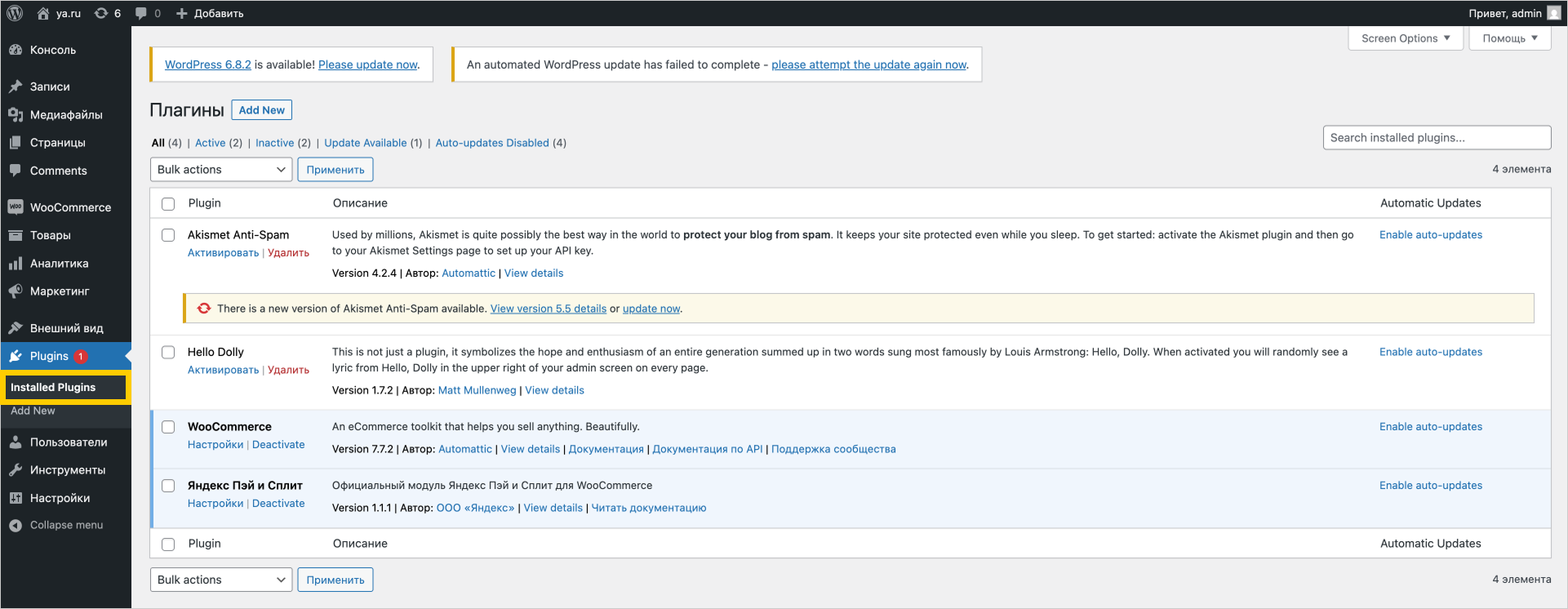 В левом меню административной панели WordPress перейдите в раздел Plugins → Installed Plugins.