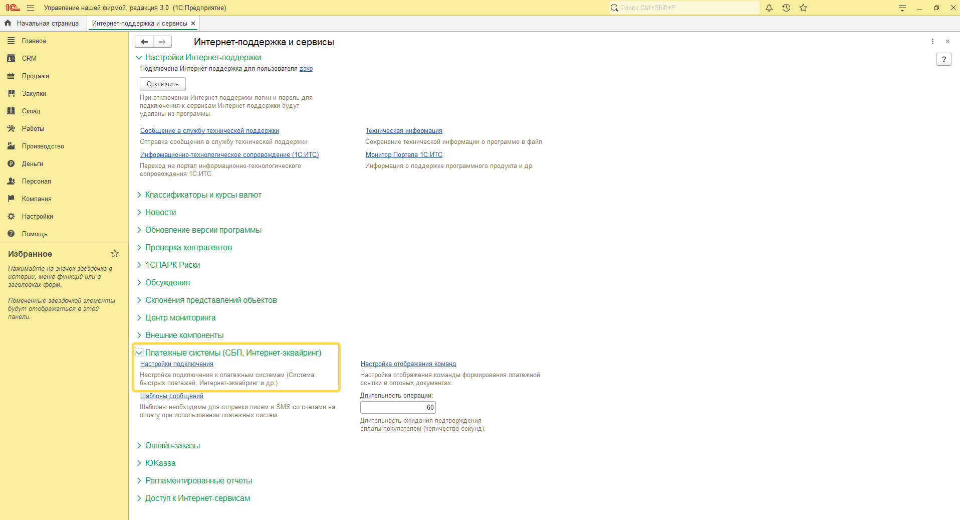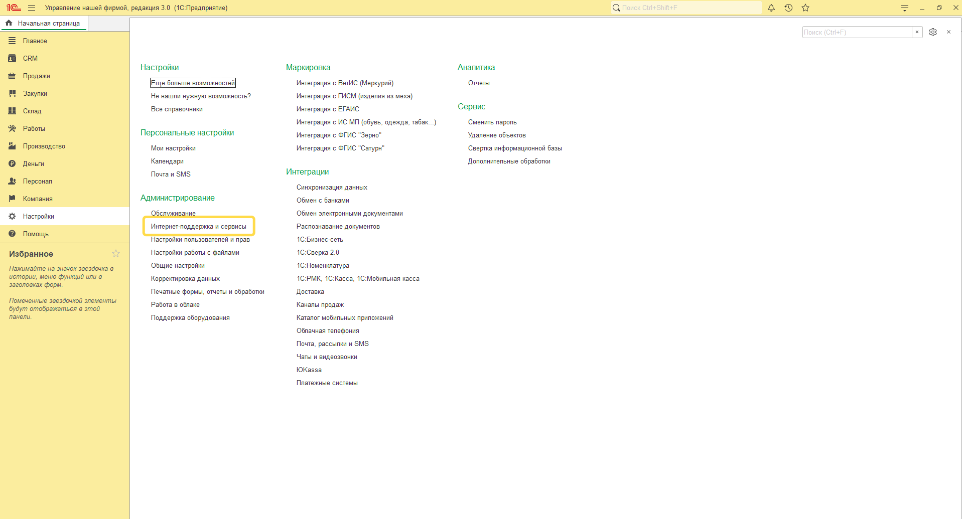 В 1С перейдите в раздел Настройки (в некоторых программах — Администрирование), выберите из списка Интернет-поддержка и сервисы.