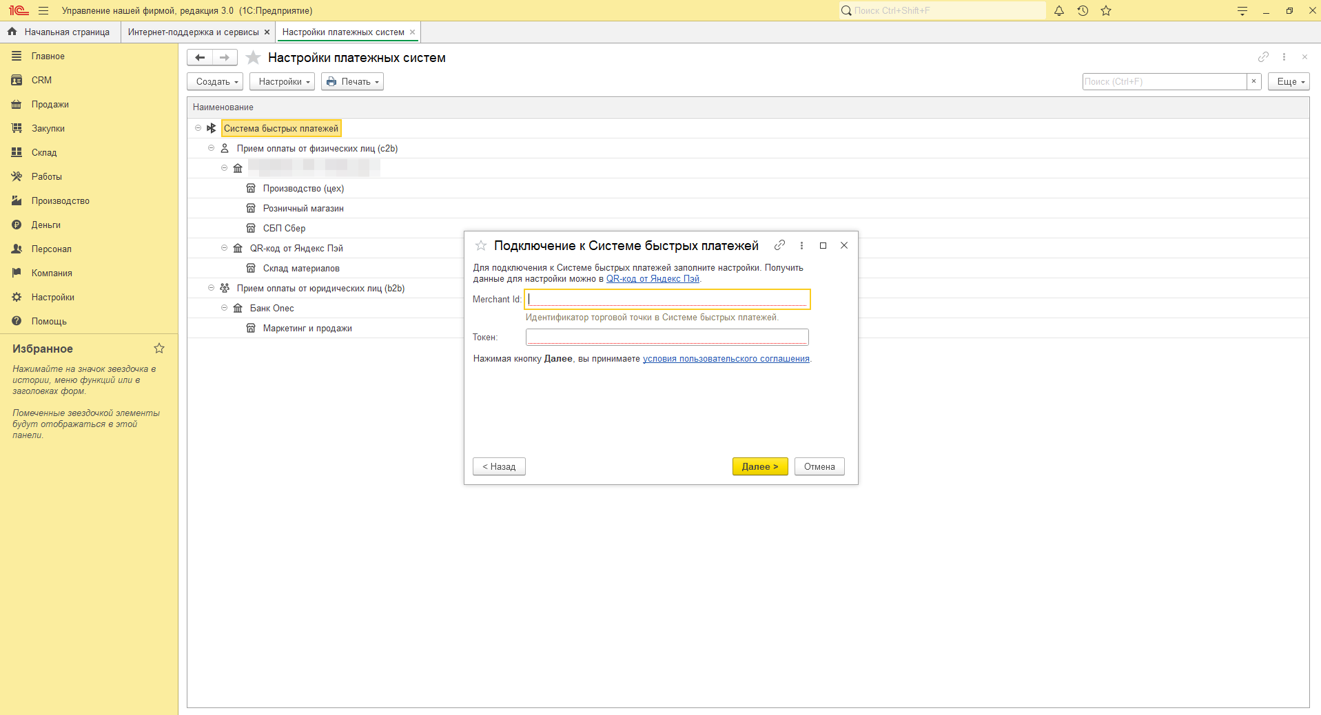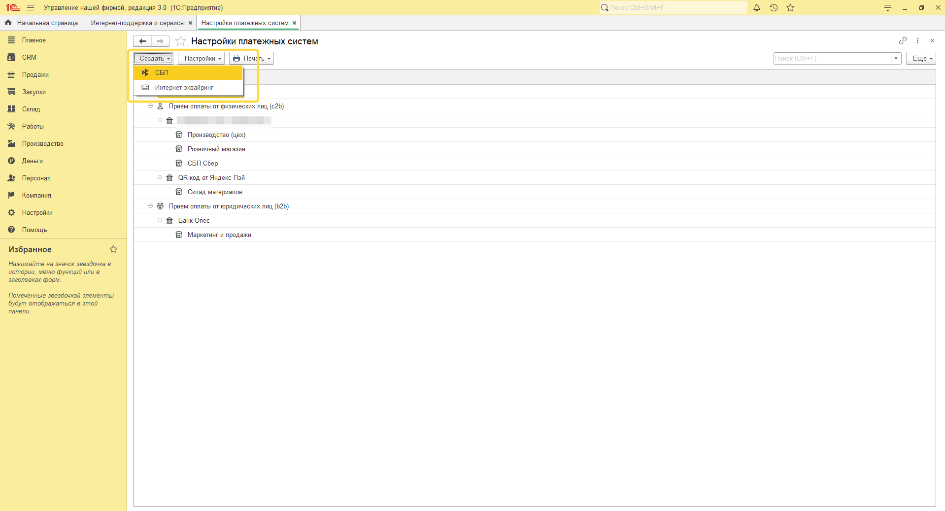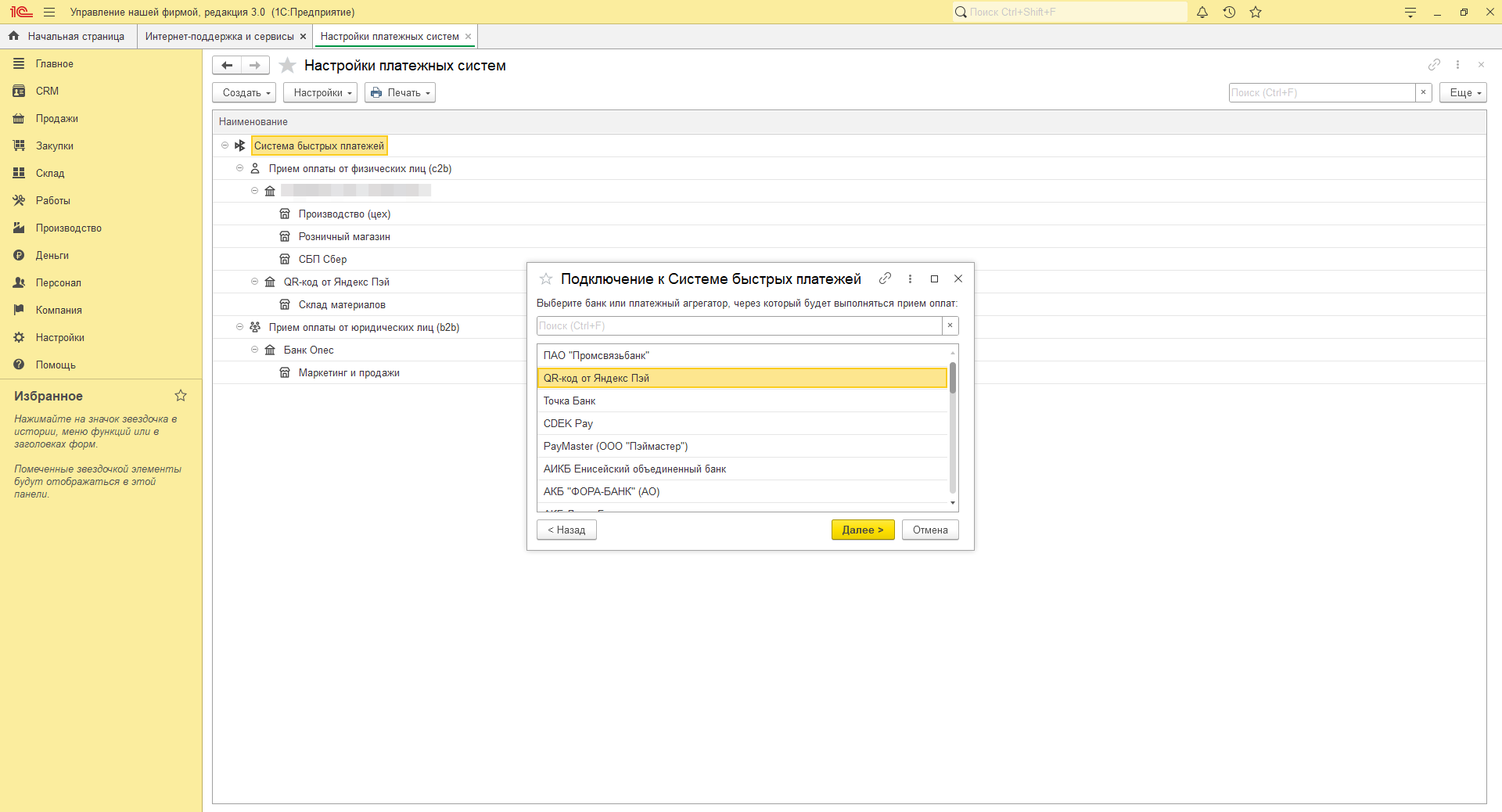В блоке Платежные системы (в старых версиях программ — Система быстрых платежей) перейдите в настройки подключения платежной системы.