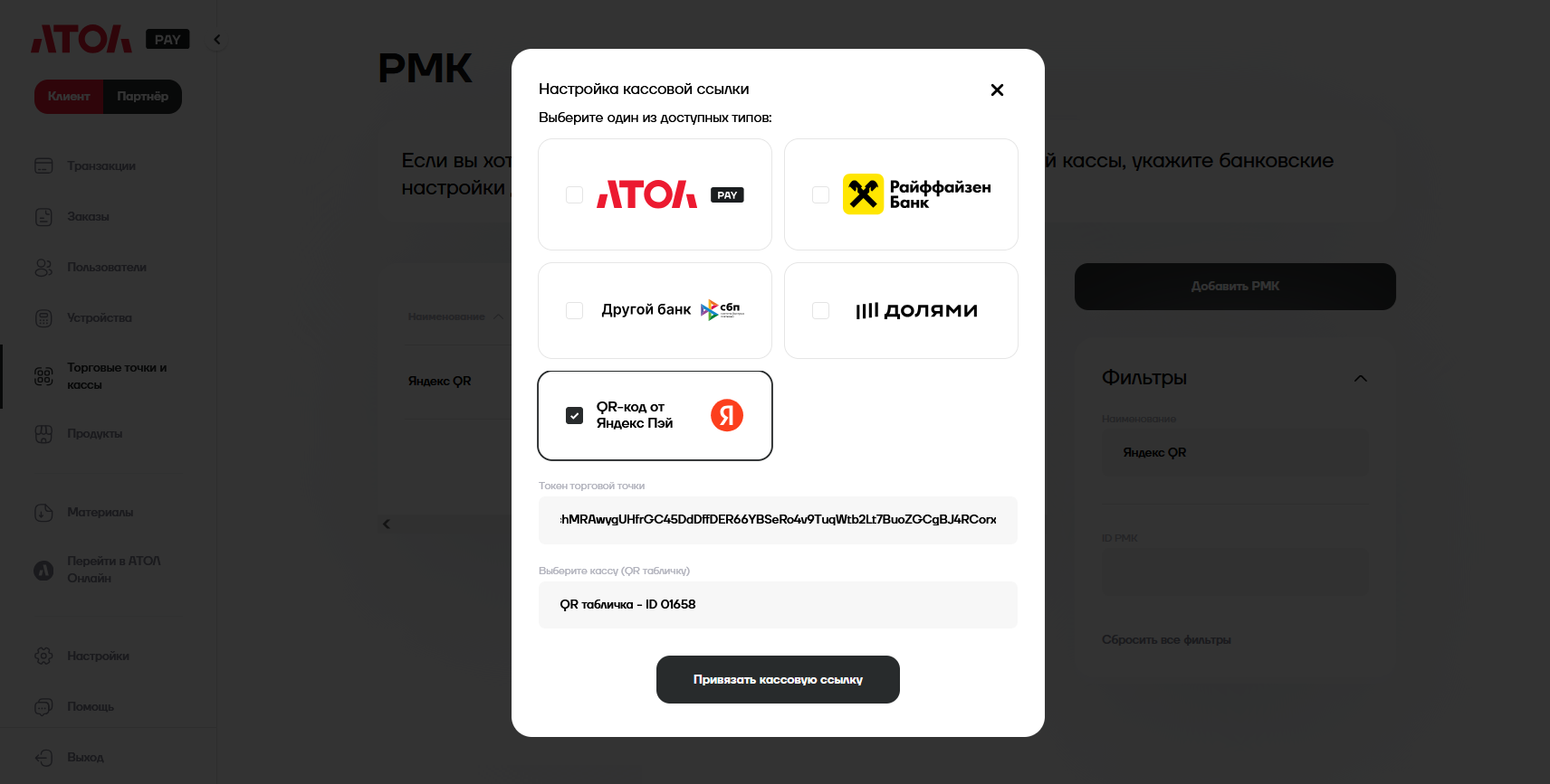 Чтобы подключить QR‑код от Яндекс Пэй, необходимо привязать табличку с QR-кодом к РМК (Рабочему Месту Кассира) в личном кабинете АТОЛ Пэй.