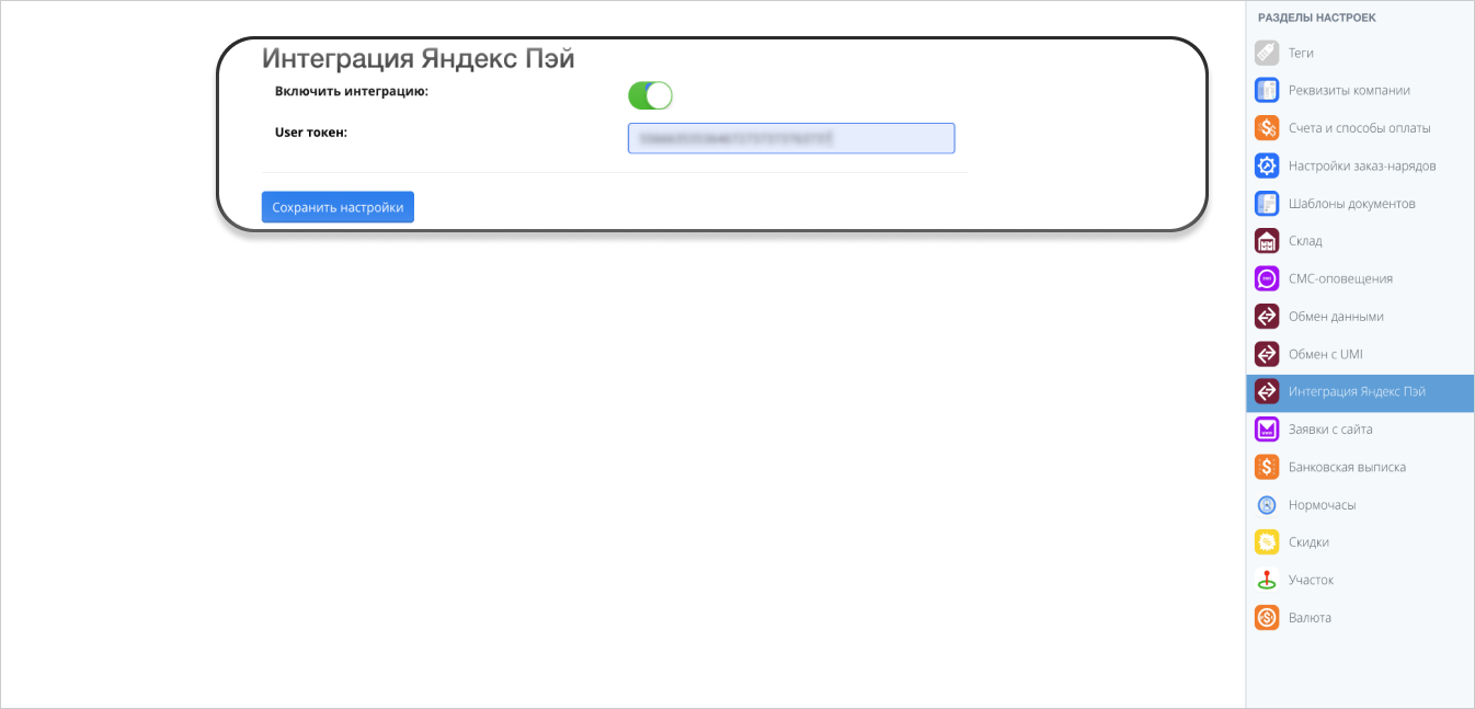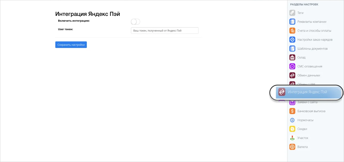 После того как вы выпустили токен, в интерфейсе iDirector перейдите в раздел Настройки и выберите пункт Интеграция Яндекс Пэй.