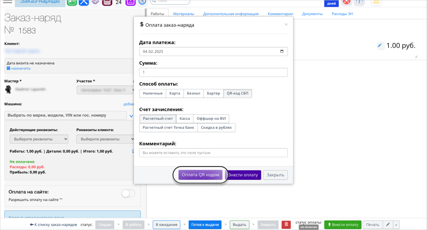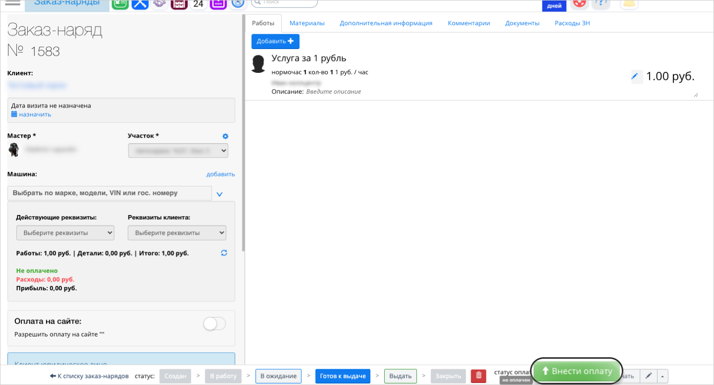 Откройте заказ-наряд, который необходимо оплатить, и нажмите кнопку Внести оплату.