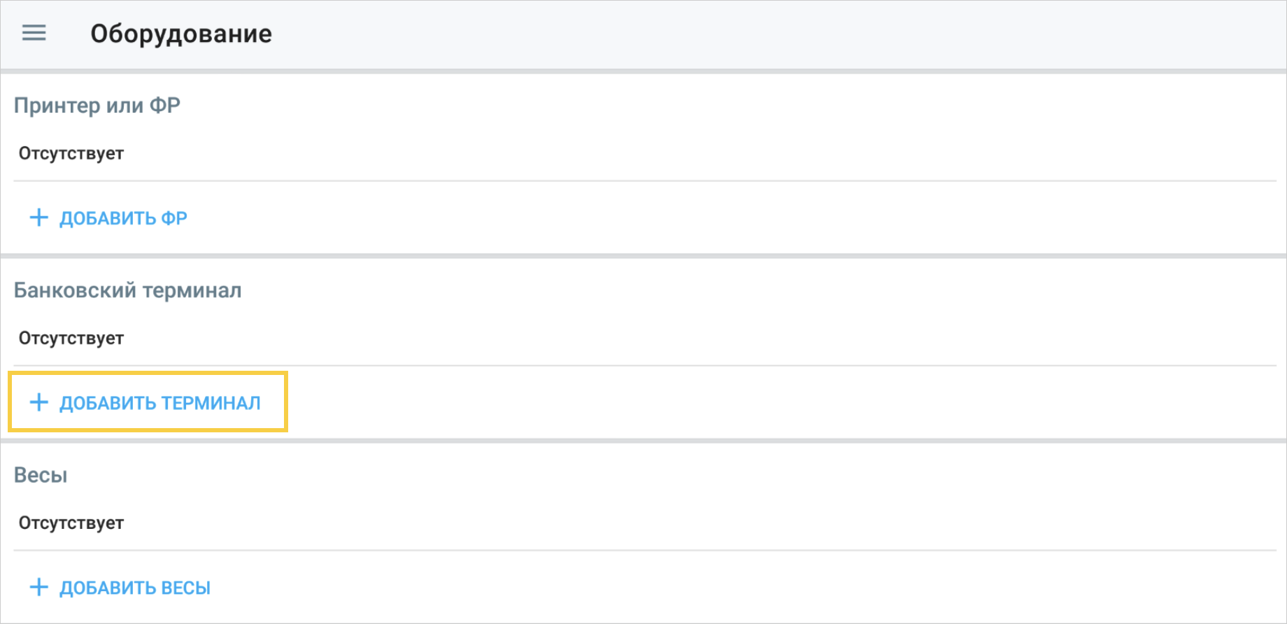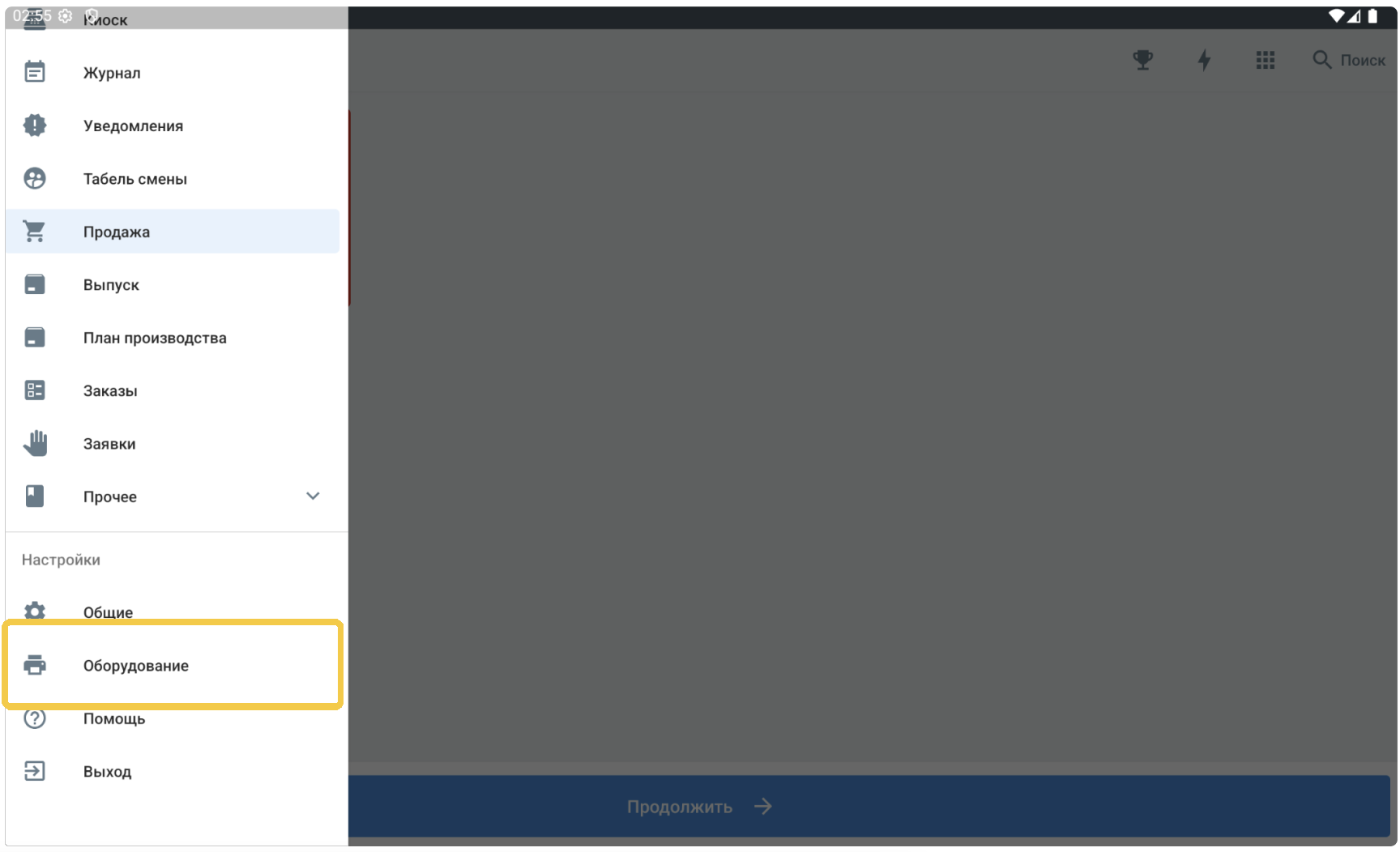 Авторизуйтесь на кассе и в меню настроек перейдите в раздел Оборудование.