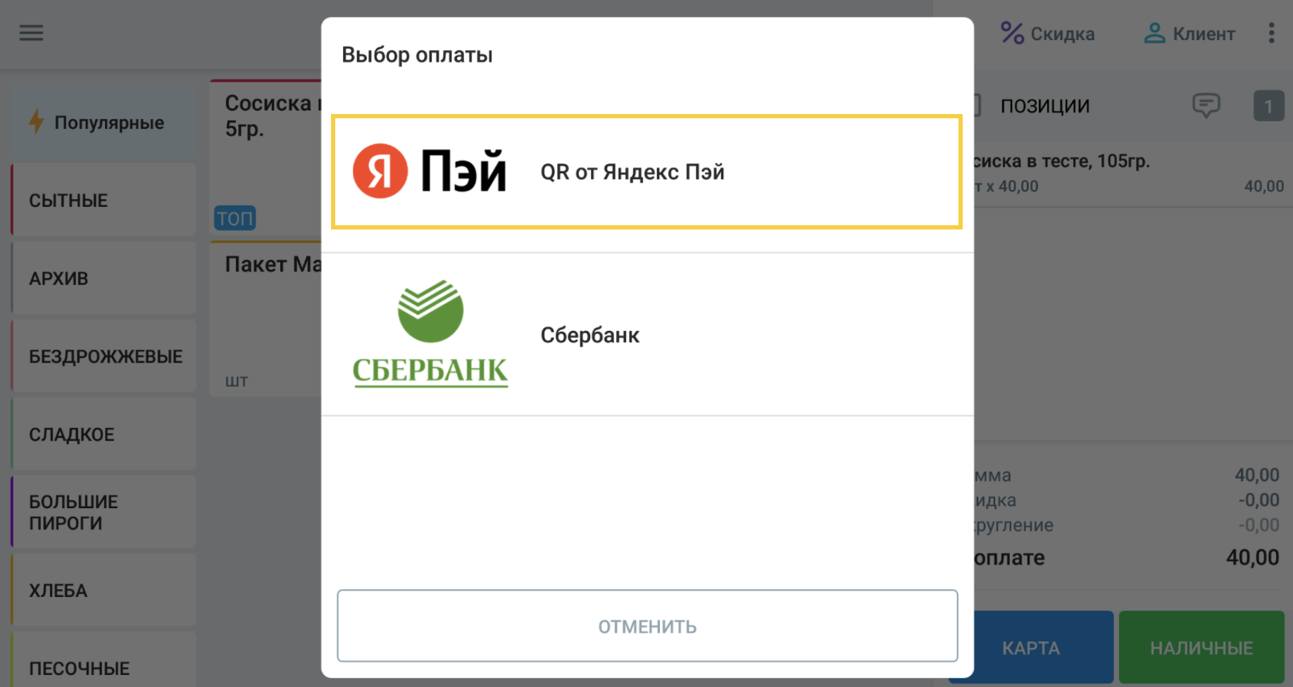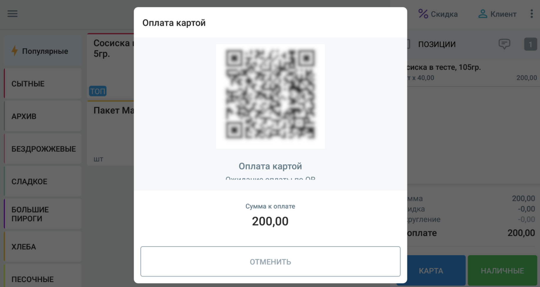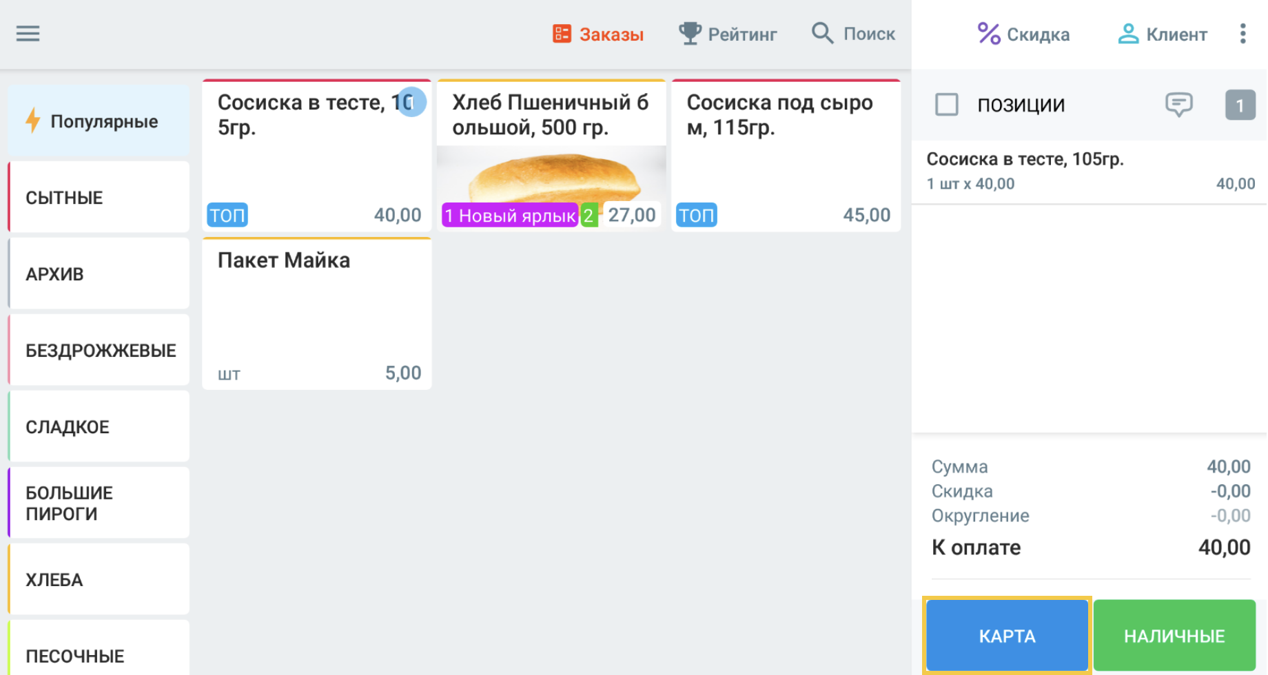 После настройки оплаты перейдите в раздел Продажа, добавьте товары в чек и выберите оплату картой.