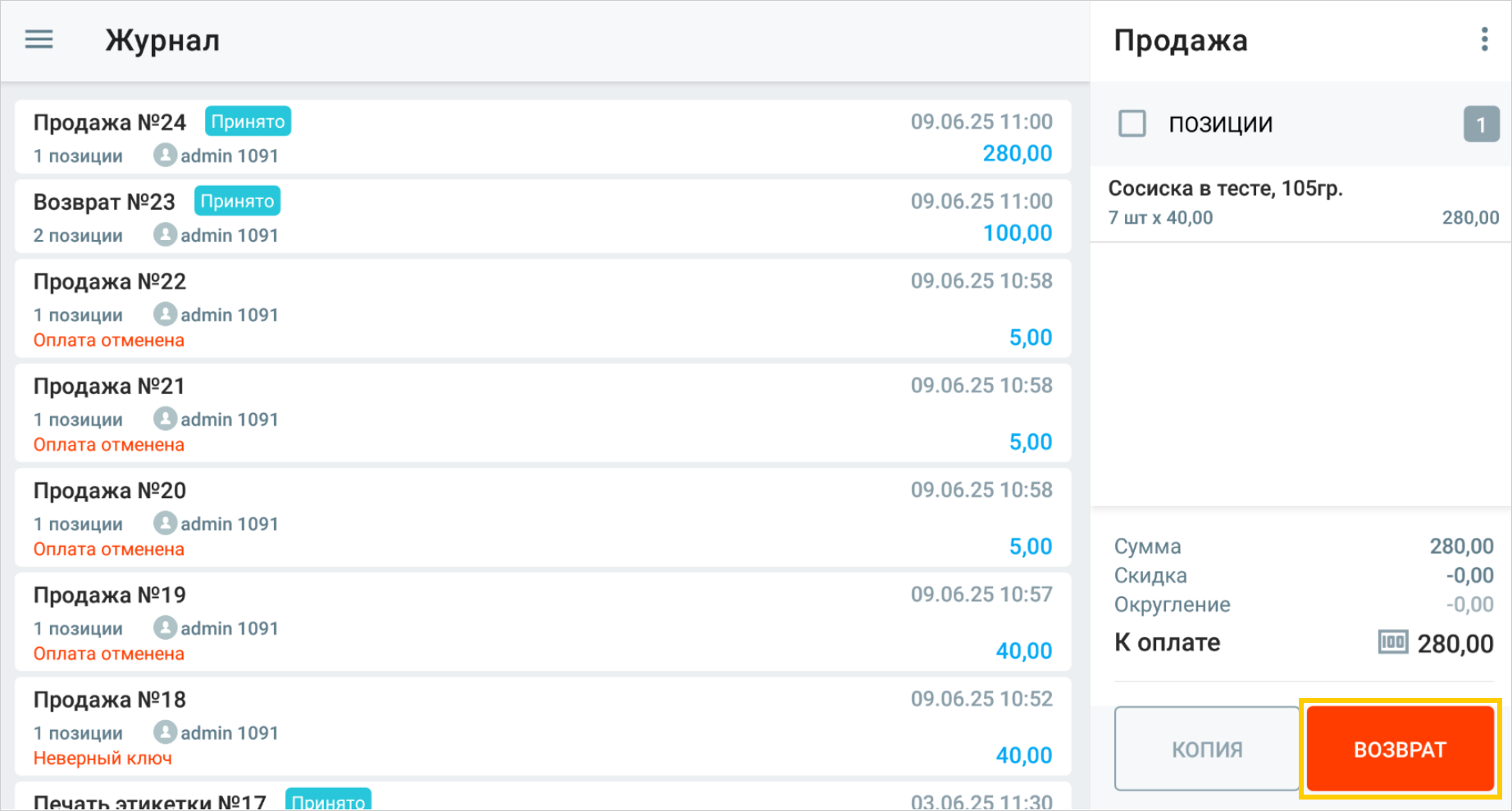Перейдите в раздел Журнал и выберите операцию, для которой хотите провести возврат.