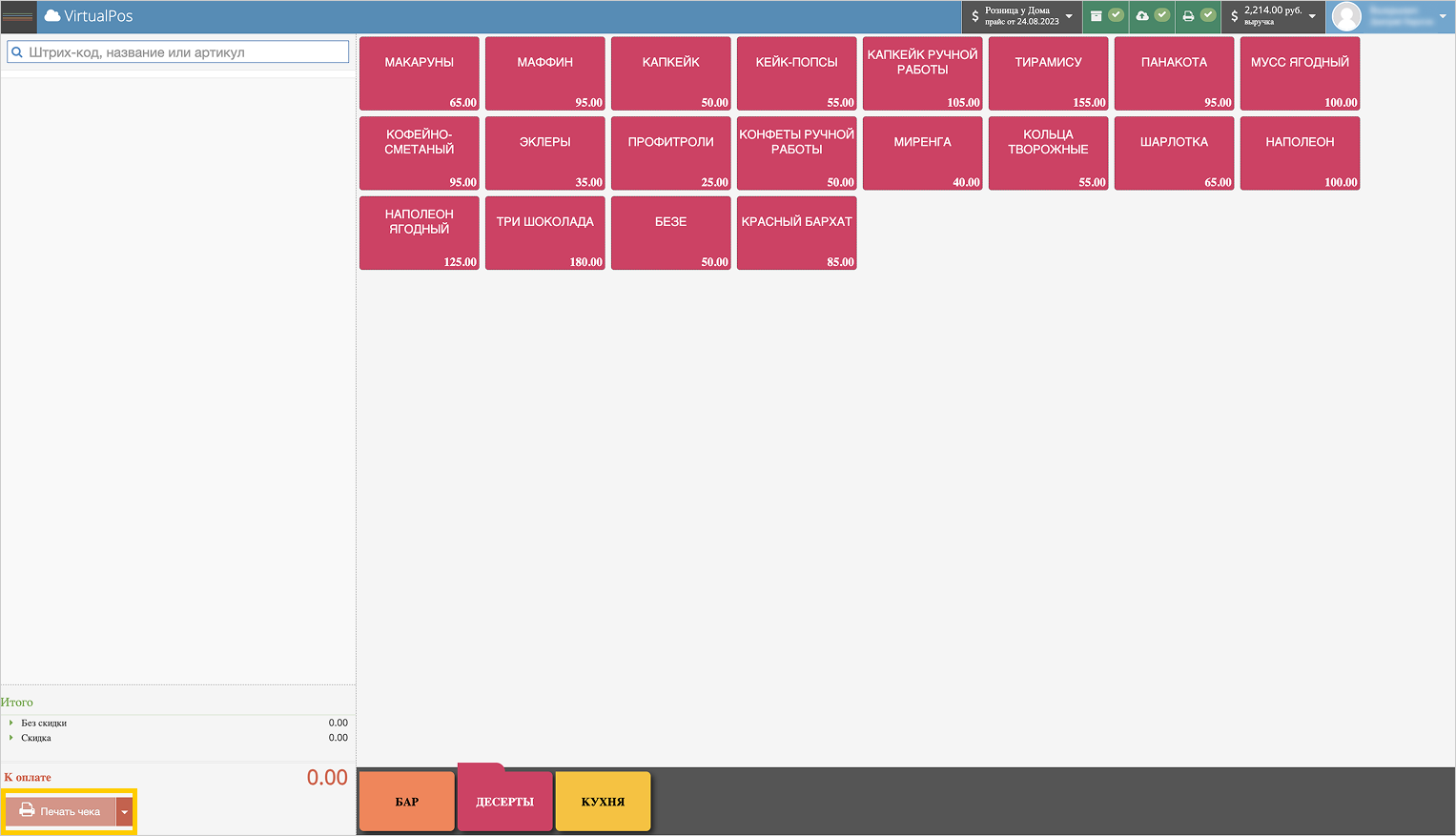 Выберите товар и нажмите Печать чека.