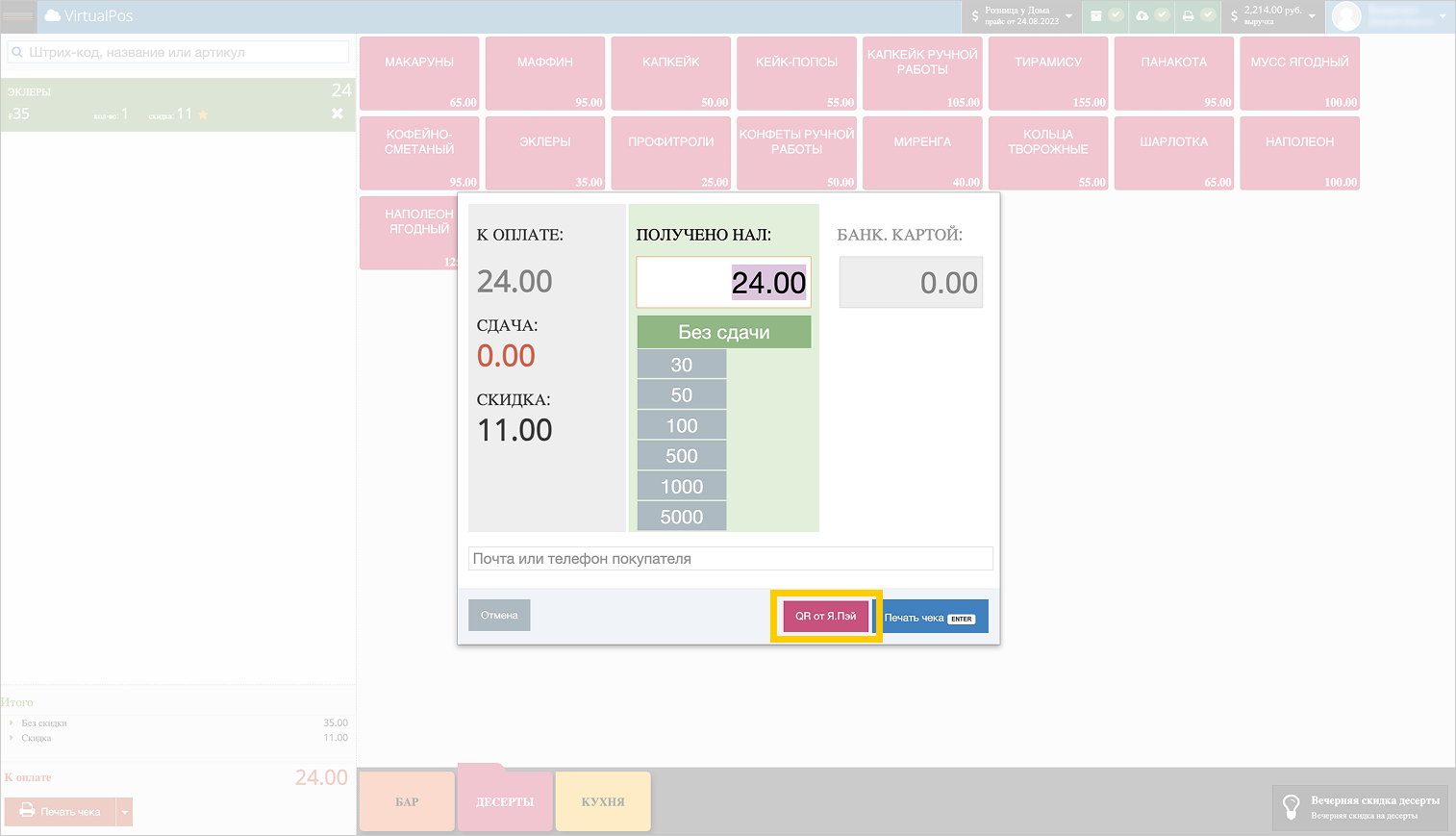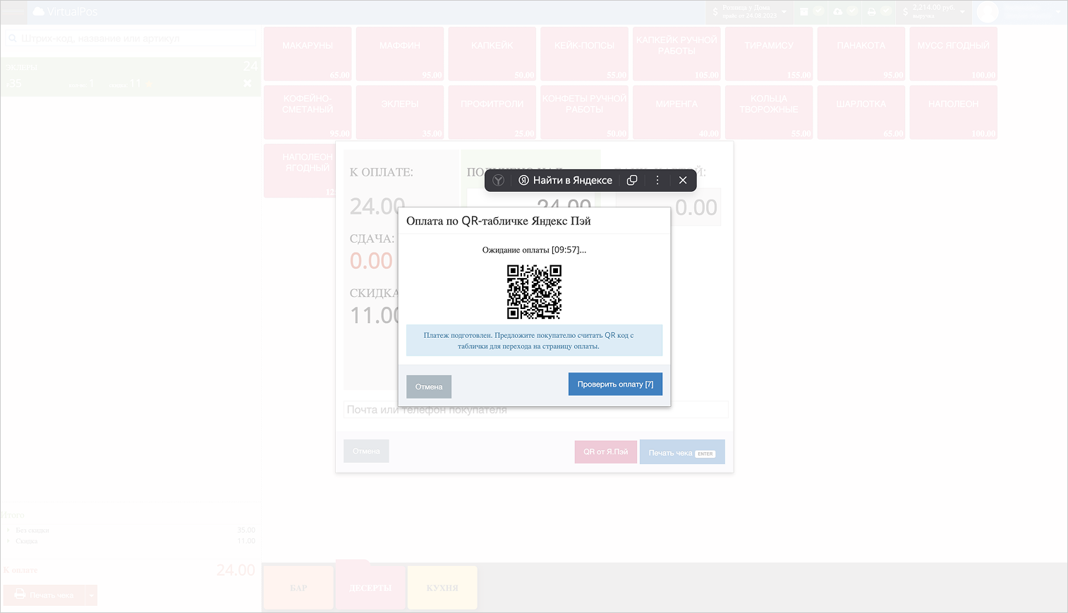 В открывшемся окне оплаты выберите способ оплаты QR от Я.Пэй.