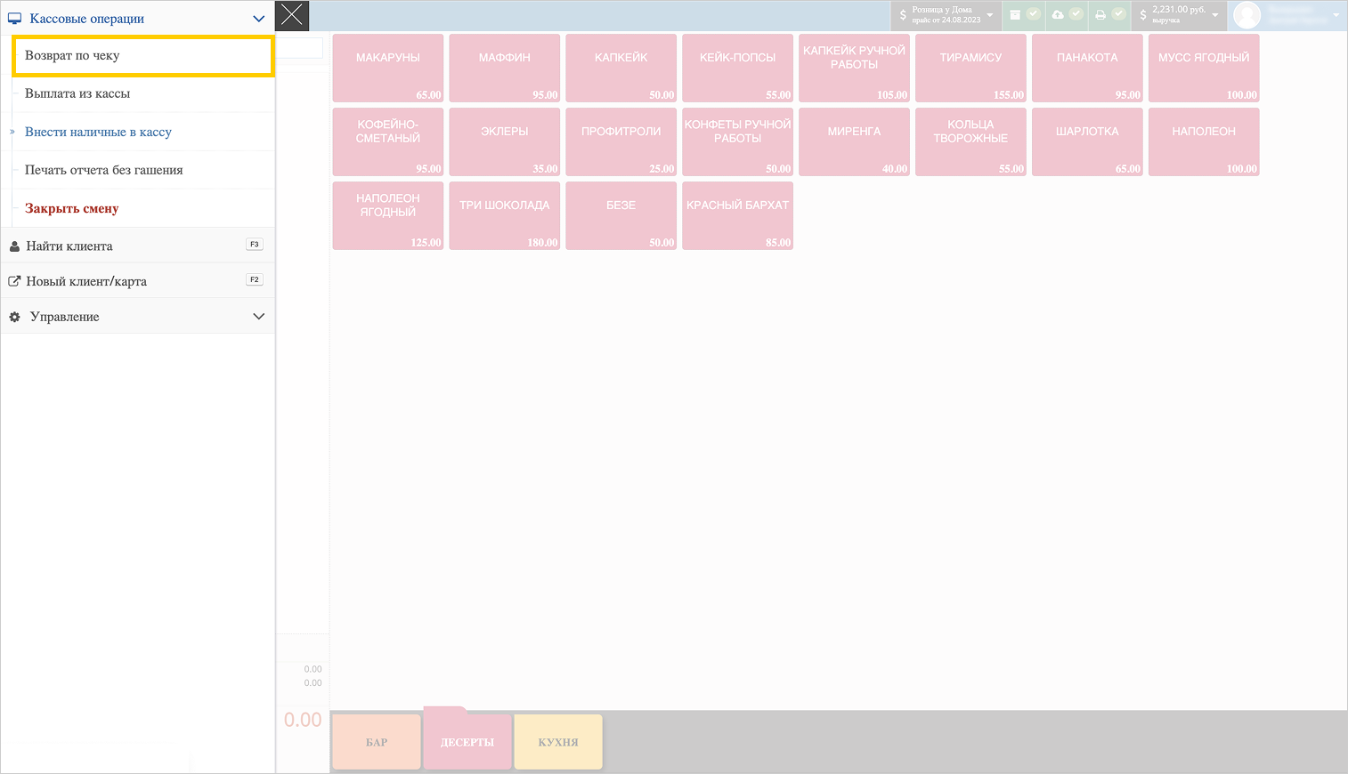 Выберите Возврат по чеку.
