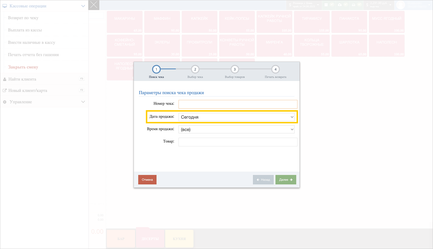 В открывшемся окне укажите дату продажи и нажмите Далее.