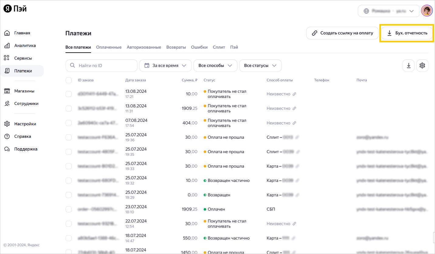 В разделе Платежи личного кабинета Яндекс Пэй вы можете вручную выгружать бухгалтерскую отчетность за день или месяц.