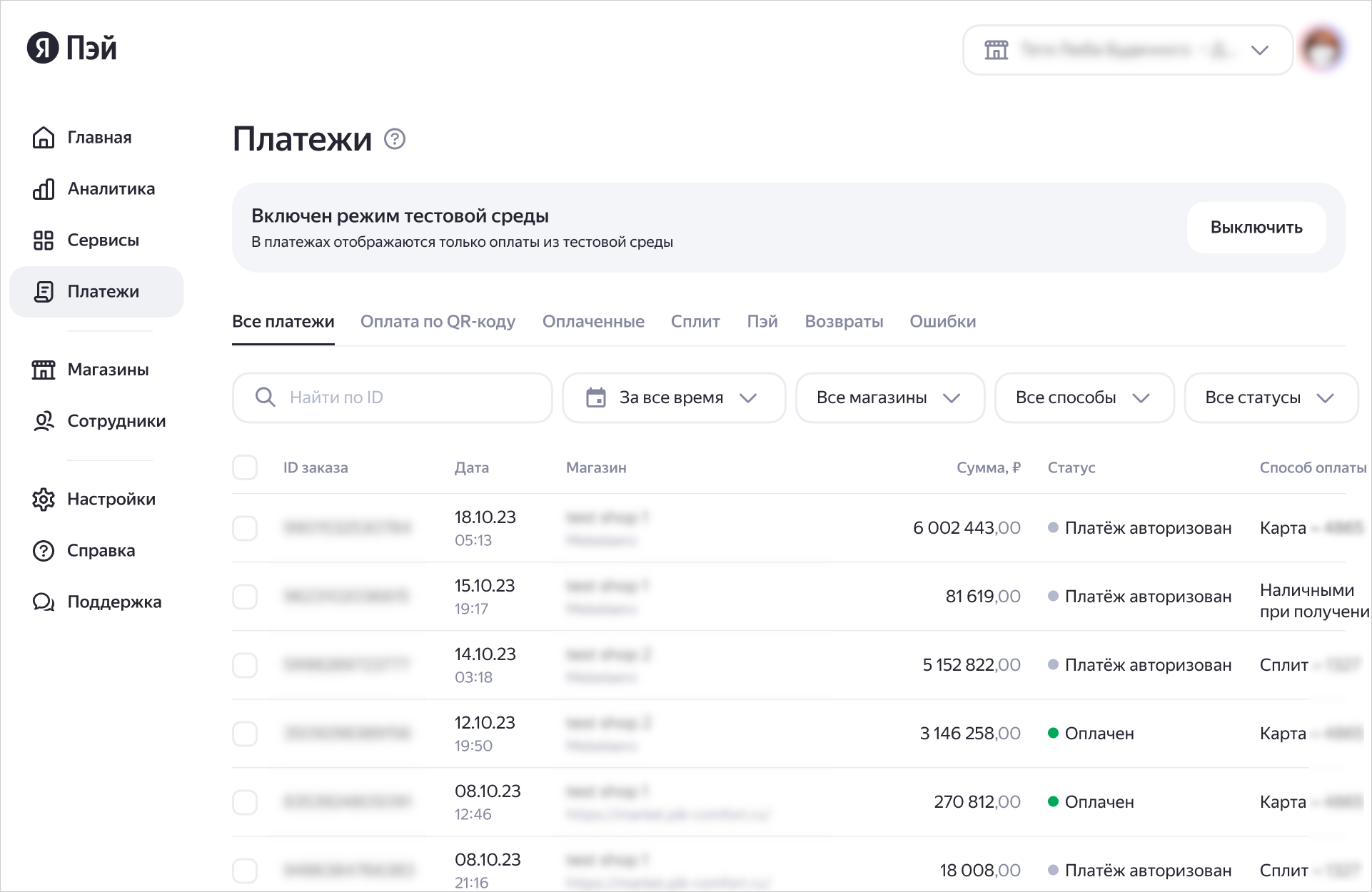 Повторно переключиться на список тестовых платежей можно только, включив тестовую среду в разделе Настройки.